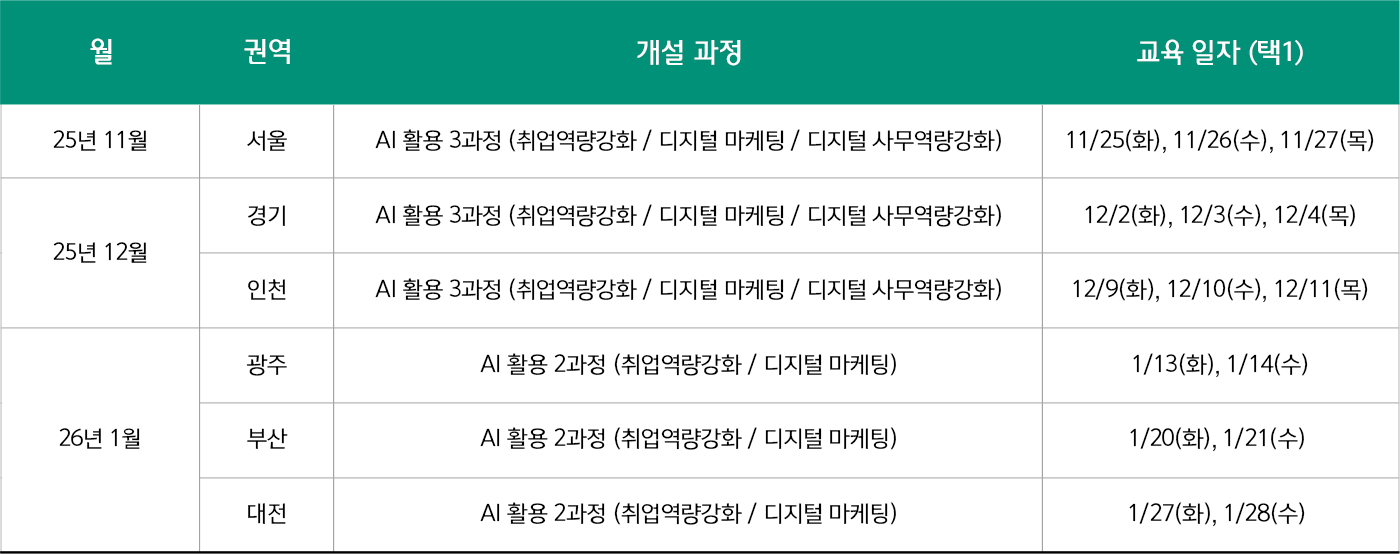 - AI 활용 취업역량강화 - AI 활용 디지털 마케팅 - AI 활용 디지털 사무역량강화 |